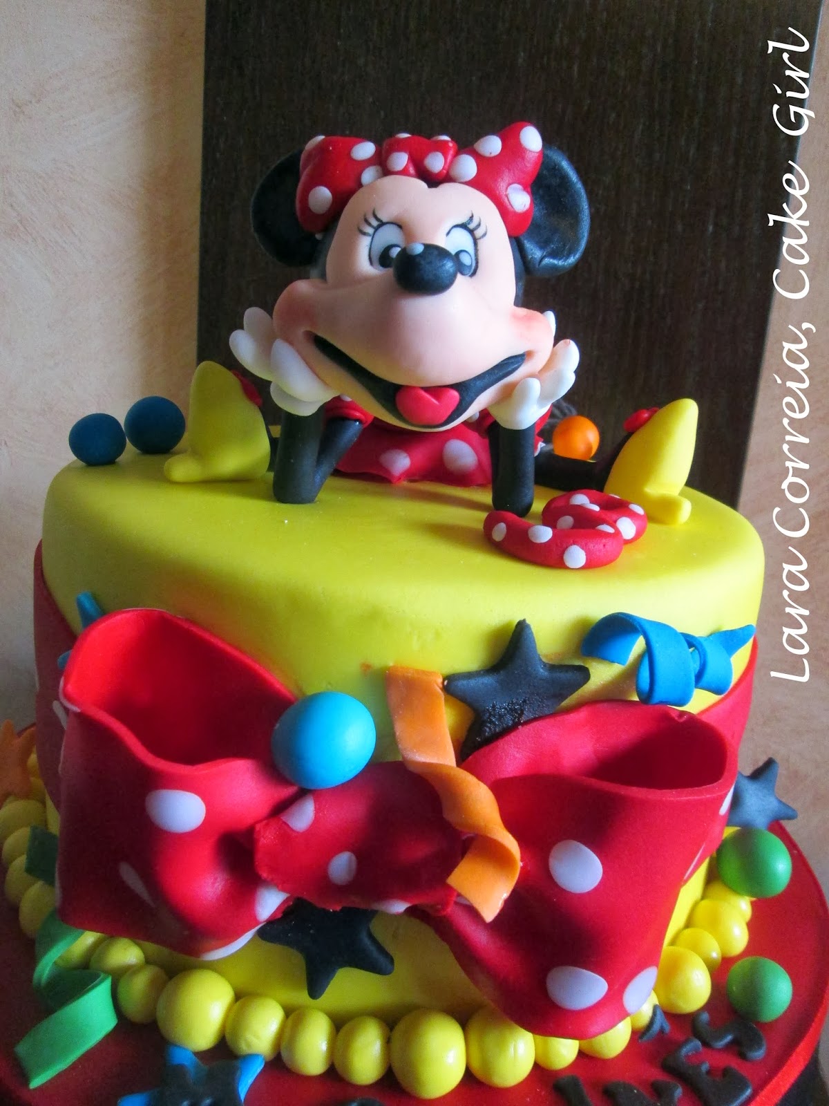 Este bolo foi feito para uma menina de 4 anos muito decidida que queria um bolo da MINNIE e do MICKEY com pintarolas e em rosa e laranja. Assim fiz.