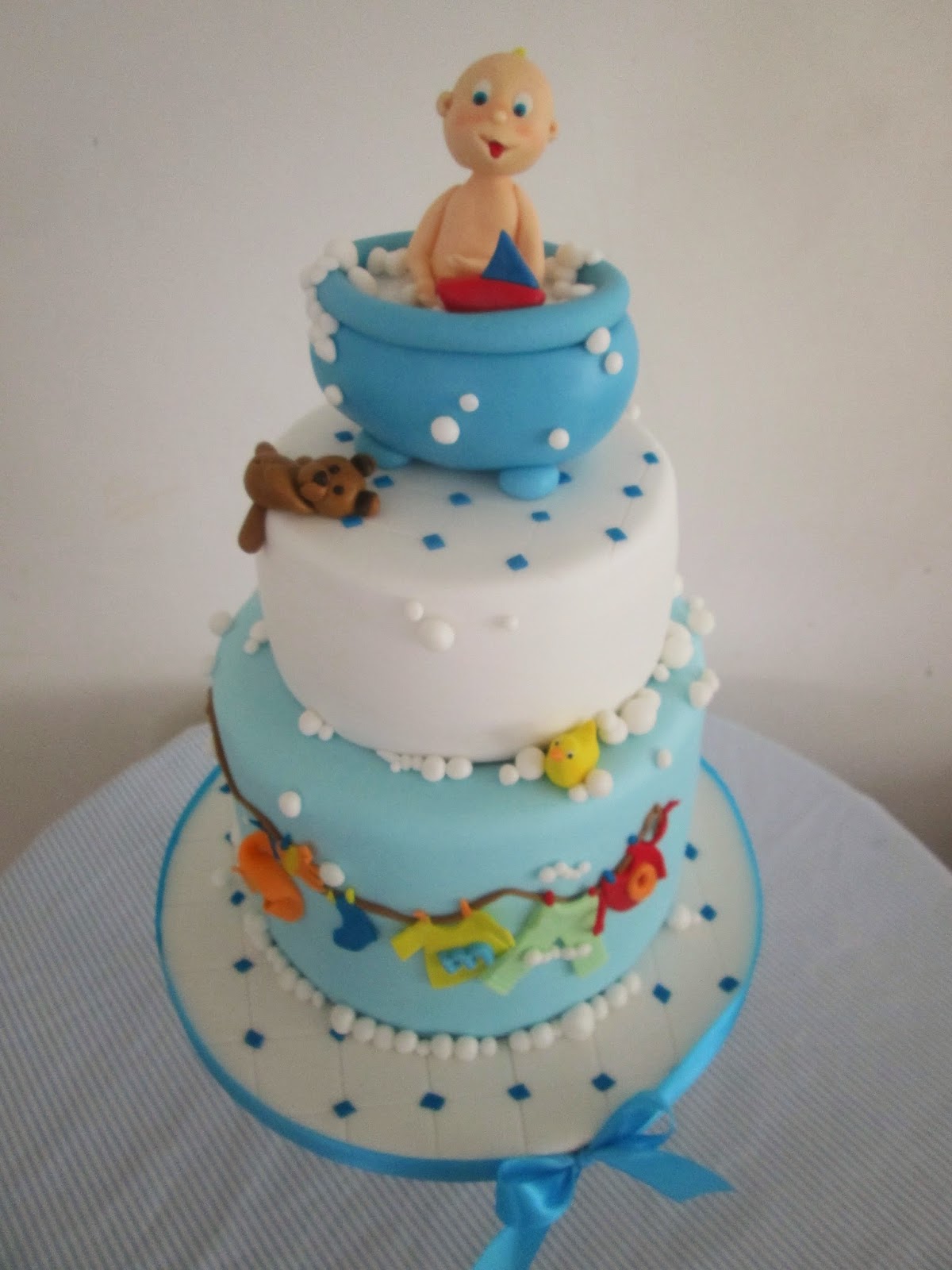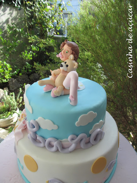 Este bolo poderia também ter servido para bolo de casamento e batizado no mesmo dia, bastáva mudar o vestido da mãe para branco.