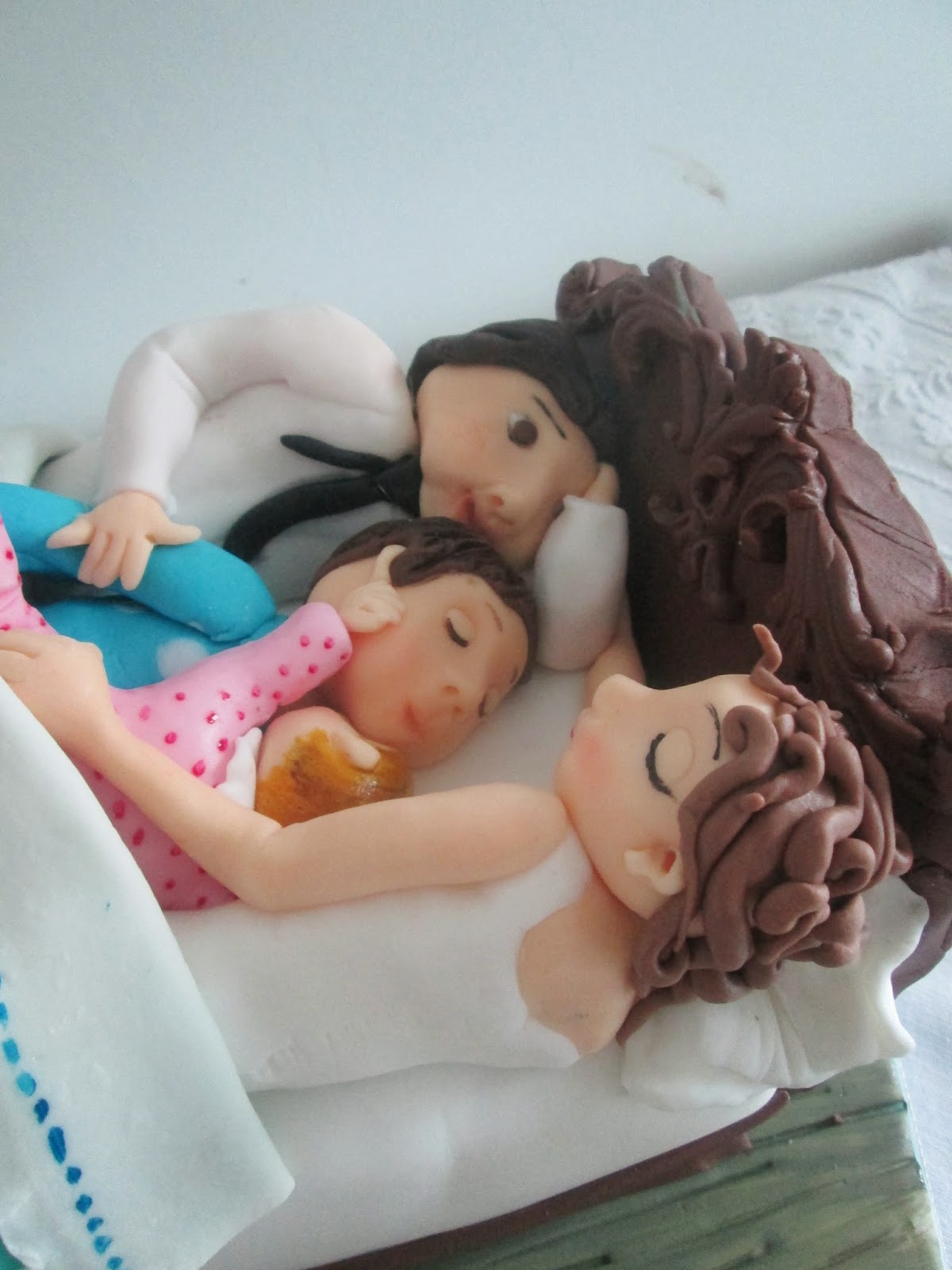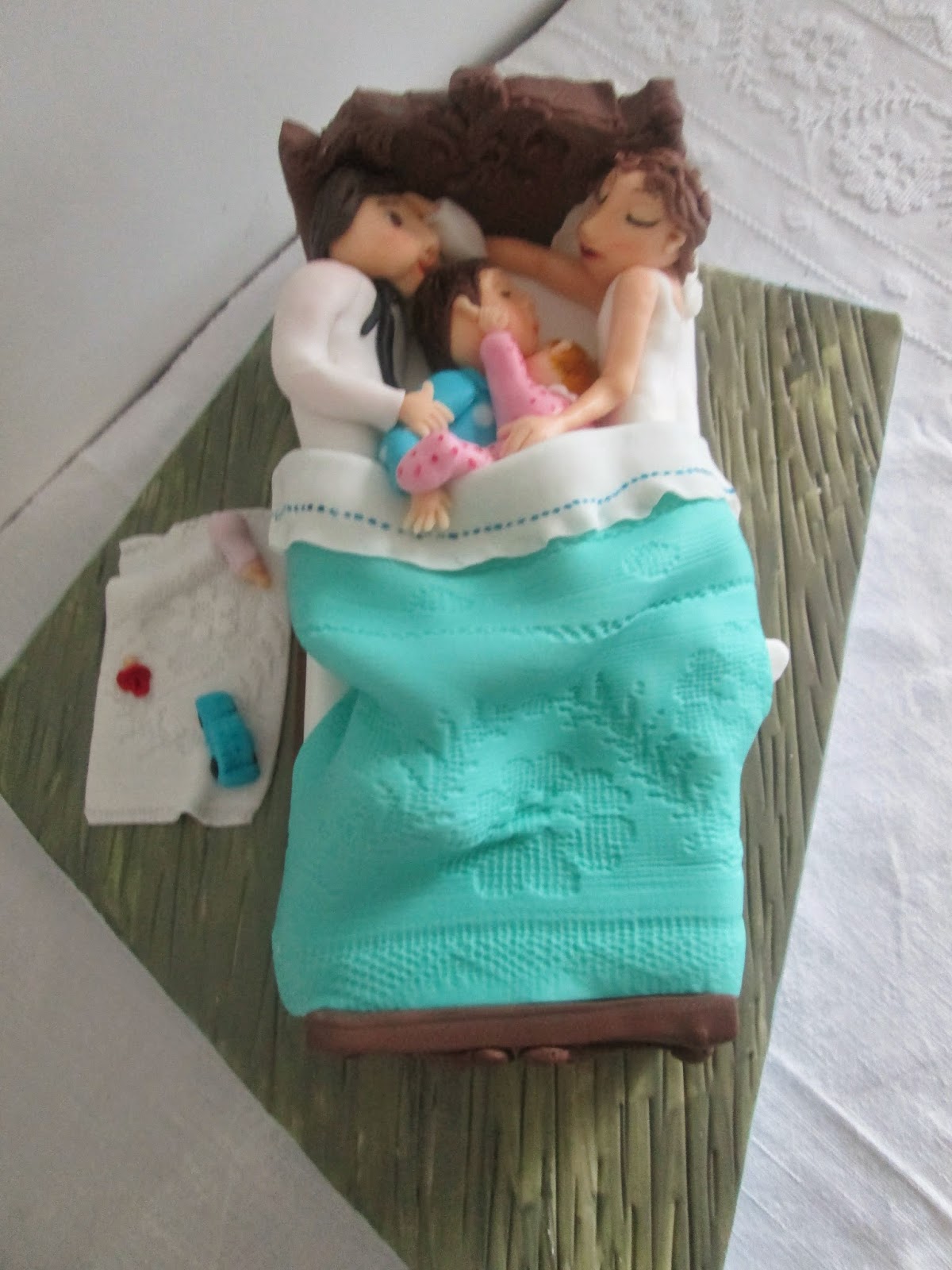 O bolo de despedida de solteiro já está a pensar na noite de núpcias dos noivos: Uma cama com os noivos e os dois filhos no meio!
