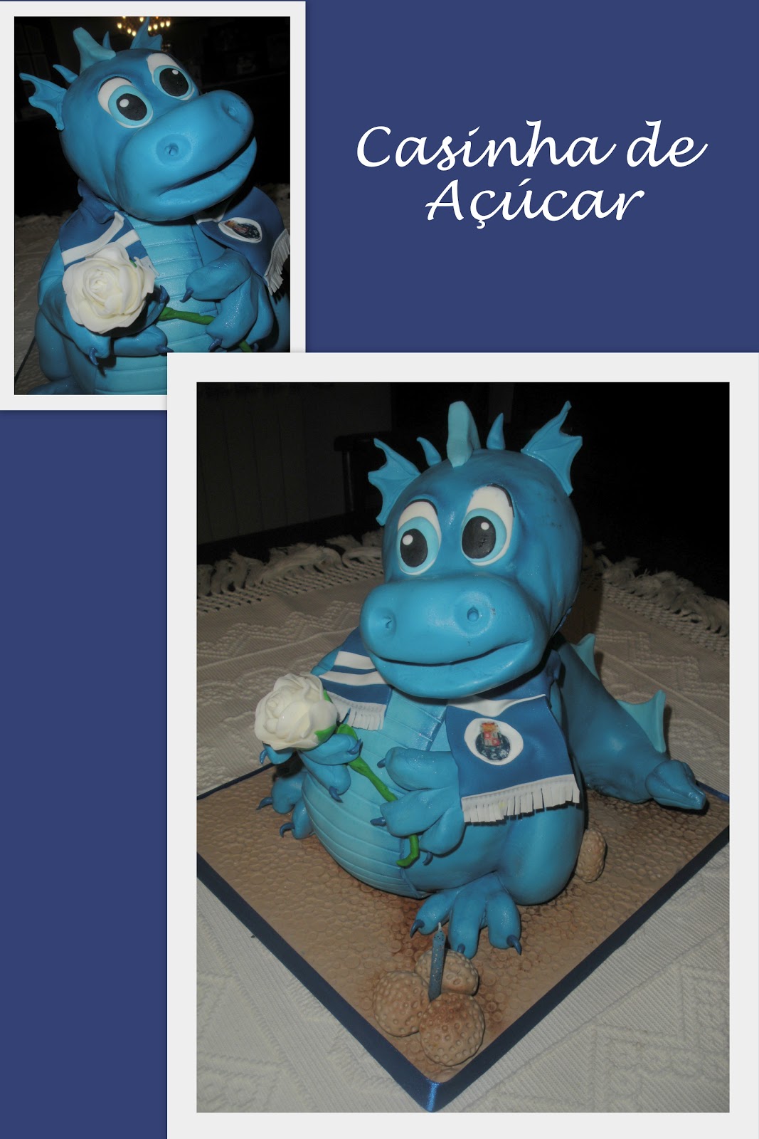 Para a minha querida e mais que mãe, tia São, uma portista ferrenha, fiz este bolo esculpido em forma de dragão. Este simpático dragão levou uma flor para lhe oferecer, mas esqueceu-se de cortar as unhas...